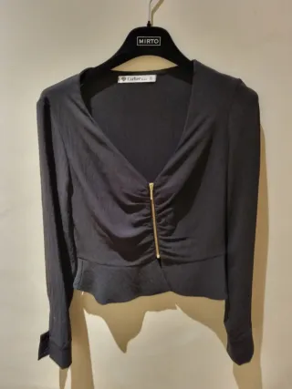 Blusa elástica de manga larga. Es de un tono grisáceo. Es de corte asimétrico en el escote y con un detalle rizado. Talla 38/40. En muy buen estado, usado solo una vez.