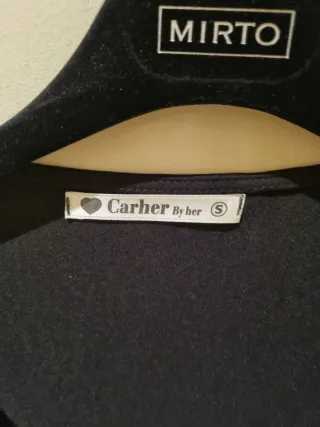 Camisa negra con un diseño moderno y favorecedor. De la marca Carher by her. Talla S. Cierre frontal, delante, con cremallera dorada. Blusa con amplio escote, diseño con cuello en V. Detalle de fruncido en la parte delantera. Corte asimétrico en el bajo, una especie de volante. Manga larga con puños. De vestir. Muy cuidada. Puesta en un par de ocasiones. Más ropa, complementos, accesorios, bisutería... zapatos... moda de mujer... en mi perfil