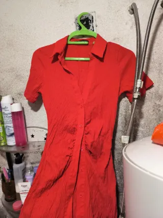 Elegante blusa roja de manga corta con cuello mao y botones. - Diseño moderno y versátil. - Tres botones frontales. - Dos bolsillos en la parte delantera.