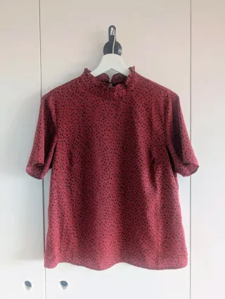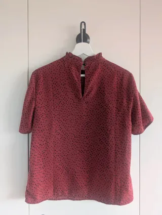 Blusa de manga corta con cuello alto y estampado, con botón de cierre trasero. Tejido poliéster. Talla 38. - Cuello con volante. - Manga corta. - Estampado negro tipo animal print sobre fondo granate. - En muy buen estado.