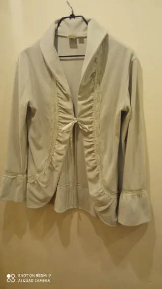 Preciosa bata corta para mujer. - Diseño con volantes y encaje. - Cierre con lazada. - Mangas acampanadas.