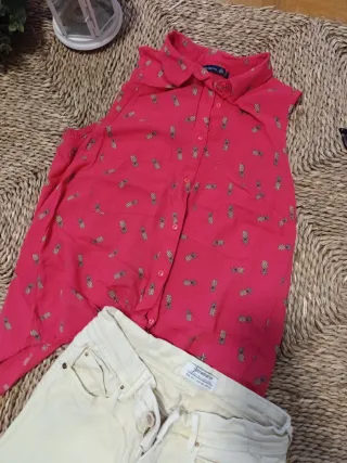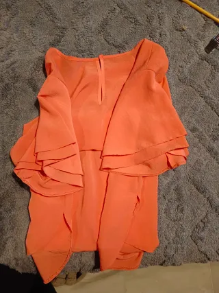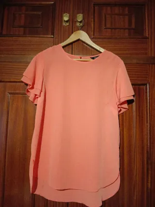 Blusa de mujer con un diseño moderno y cómodo. El color es coral. No necesita plancha. No la he usado. - Manga corta. - Dos bolsillos en la parte delantera. - Cierre de botones.
