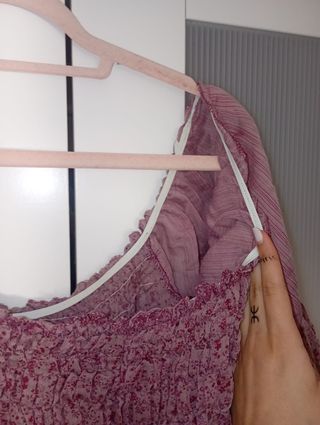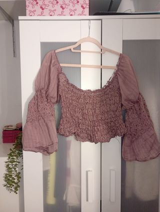 Blusa corta color rosa viejo con cuerpo fruncido elástico , esta usado Está usada pero en buen estado. El elástico de la cintura está un poco menos fuerte por el uso