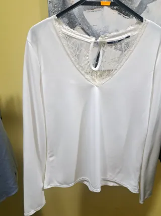 Blusa elegante de manga larga con detalles de encaje en el cuello. En el hombro tiene un pequen̈o corte,atras en el hombro,apenas se nota,hay una foto donde se aprecia. - Color blanco. - Cuello en V con detalle de encaje. - Abertura en la espalda con cierre de lazada.