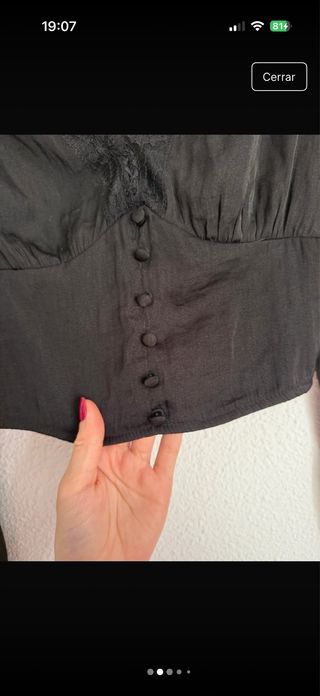 Elegante blusa de seda con manga larga. - Diseño con escote en V y detalles de encaje. - Cierre frontal con botones. - Corte ajustado en la cintura.