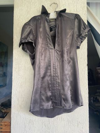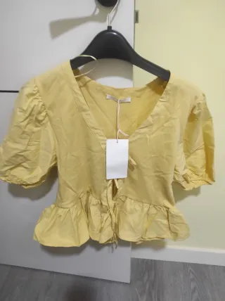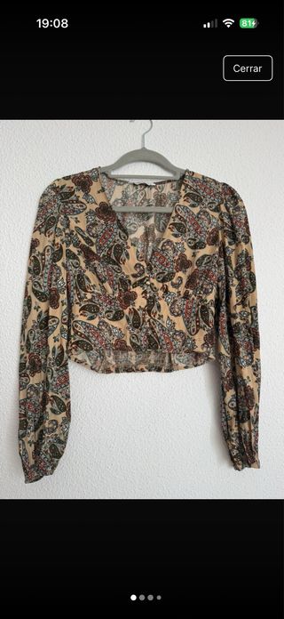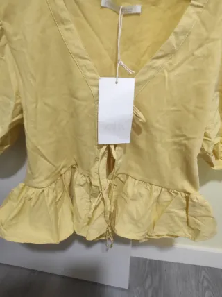 Blusa corta de manga larga con cuello camisero y detalle de lazada en la cintura. - Diseño cropped. - Puños abotonados. Es abierta, para poner algún top debajo o tal. Esta completamente nueva, se quito la etiqueta pero no se llego a utilizar ni si quiera una vez.