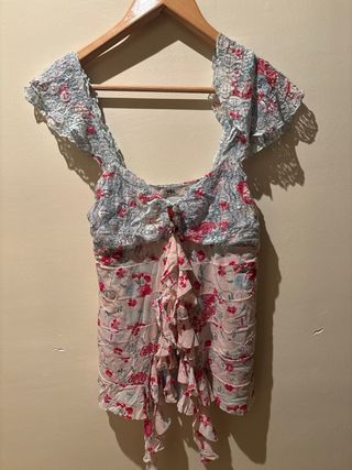 Bonita blusa de encaje con un delicado estampado floral. - Diseño de manga corta. - Cuello redondo. - Tejido de encaje con flores en tonos rosas, azules y blancos.