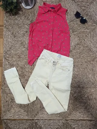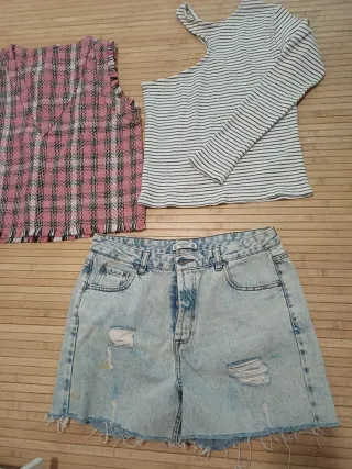 Conjunto de dos blusas y un pantalón corto. - Blusa de rayas con un hombro. - Blusa de cuadros rosa. - Pantalón corto vaquero con rotos.
