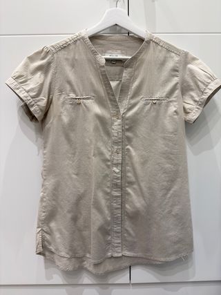 Blusa de manga corta con cuello mao y botones. - Tejido ligero y translúcido. - Detalle de bolsillo en el pecho.
