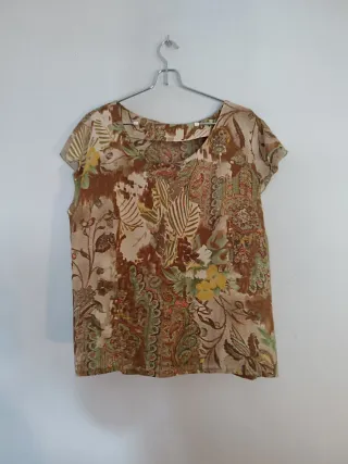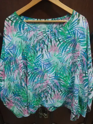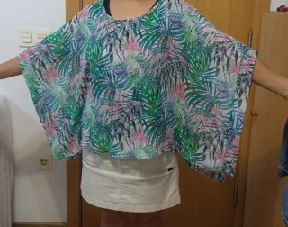 Blusa con un llamativo estampado de hojas tropicales. En muy buen estado. - Diseño tipo poncho o mariposa. - Tejido ligero y vaporoso. - Manga corta amplia.