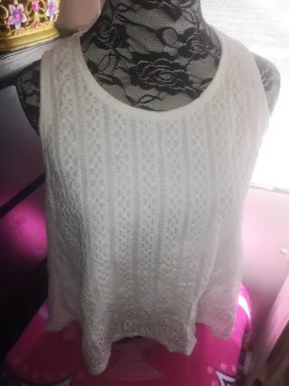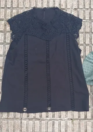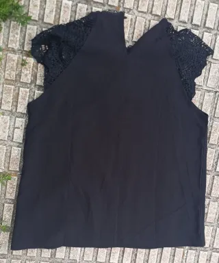 Elegante blusa sin mangas con un diseño bicolor sin estrenar. - Detalle de encaje en los hombros. - Tejido ligero y vaporoso. - Corte recto. - En la etiqueta talla una 52.
