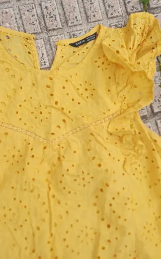 Blusa de color amarillo vibrante con un diseño único. - Mangas cortas con detalle de encaje floral. - Escote con borde festoneado. - Corte holgado y cómodo.