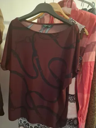 Elegante blusa de Ralph Lauren con un llamativo estampado. - Diseño con estampado de correas y hebillas. - Manga corta y escote barco. - Tejido ligero y fluido. Color burdeos y azul marino