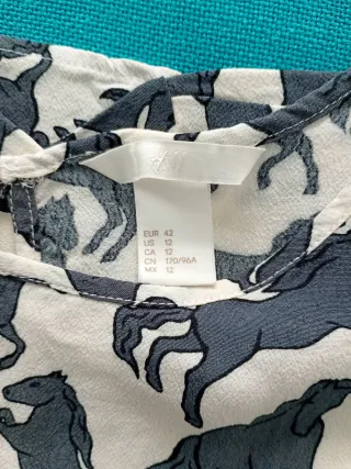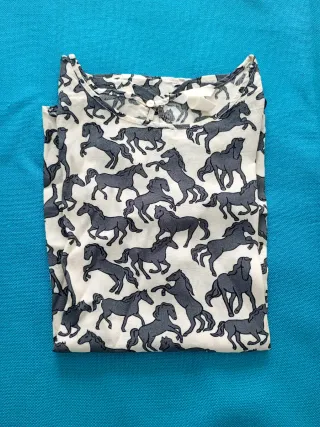 Blusa con un divertido estampado de caballos en tonos grises y blancos. Es una prenda ligera y con un diseño único. Talla 42 - Estampado de caballos. - Cuello redondo con detalle de botón. - Manga corta.