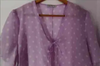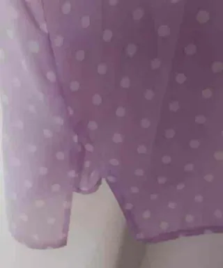 Blusa color lavanda suave de gasa semitransparente con un delicado estampado de lunares. - Diseño con escote en V y cierre de lazada. - Corte holgado tipo blusón y mangas cortas. - 57 cm de ancho de hombros × 75 cm de largo.