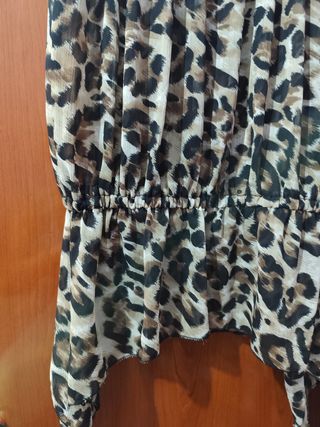 Preciosa blusa de estampado animal print en tonos marrones y beige. Es semitransparente y tiene un diseño favorecedor. - Es de manga corta. - Tiene un elástico en la cintura. - El bajo es asimétrico. -Pone xs, pero da bastante talla.