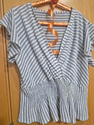 Blusa de rayas con diseño cruzado y fruncido en la cintura.Color lila pastel y blanco de rayas. - Tejido ligero y cómodo. - Mangas cortas con volantes. - Escote en V pronunciado.