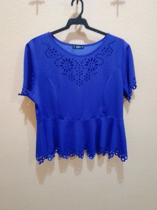 Blusa de mujer de vestir grande, color azul eléctrico, de manga corta, con cuello redondo. Con dibujos cortado láser en delantero, mangas y bajo. Pinzas en delantero y corte en caderas ajustado con volante. Talla 3XL, marca SHEIN. 95% poliéster, 5% spandex. Nueva sin estrenar. Medidas: de sisa a sisa 57'5cm, pecho 115cm, cintura 105cm, caderas 160cm, largo 65'5cm, ancho de hombros 46cm.
