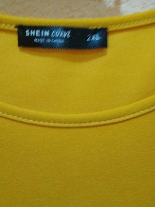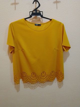 Blusa de mujer de vestir de manga corta, color mostaza, con cuello redondo. Con dibujos cortado láser en bajo. Con pinzas en el pecho. Talla 2XL, marca SHEIN, 95% poliéster, 5% spandex. Nueva sin estrenar. Medidas: de sisa a sisa 61cm, pecho 122cm, cintura 124cm, caderas 130cm, largo 66cm, ancho de hombros 44'5cm.