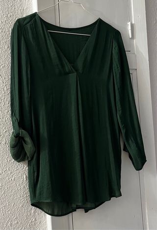 Blusa de seda en color verde. Es de Stradivarius, corté la etiqueta porque molestaba pero no llegué a estrenarla. - Talla: M. - Manga tres cuartos - Cuello en pico - Detalle de pliegues en la espalda - Tejido fluido y suave