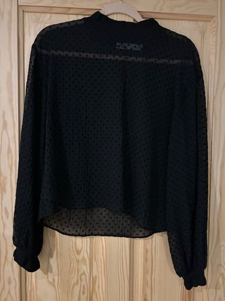 Elegante blusa negra de Zara con un diseño de lunares. - Tejido transparente. - Mangas largas abullonadas. - Cuello alto.