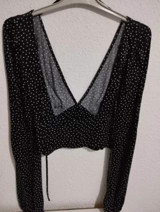 Blusa cruzada crop de color marrón con lunares blancos. Tiene dos botones interiores para que no se abra. Las mangas son bastante amplias y fluidas. Talla L (en la foto me he hecho un apaño porque me está grande, soy S). Está nueva con etiqueta.