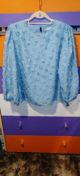 Blusa amplia con mangas abullonadas, con textura, tipo lunares. Cierre en lágrima en la espalda. Es una prenda delicada y atractiva. - Diseño flocado con textura suave. - Cuello redondo.