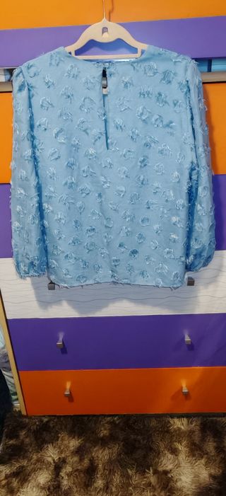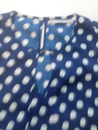 Preciosa blusa de Zara con estampado de lunares azules sobre fondo blanco. Es de manga larga y tiene un bonito detalle de volantes en el cuello y los hombros. - Cierre de botones. - Tejido ligero y agradable al tacto.