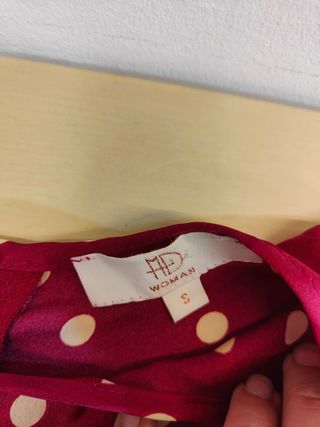 Blusa de mujer con un diseño único, de lunares blancos sobre fondo rojo. - Cuello camisero. - Cierre de botones. - Manga corta. - Equivalente a una talla M aprox.