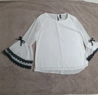 Elegante blusa blanca de manga acampanada con detalles de encaje. Transparenta. Le quité la etiqueta con la talla y no la recuerdo, así que pongo las medidas en las fotos. #blusa #top #blanco #negro #rlinea #comonuevo #volantes