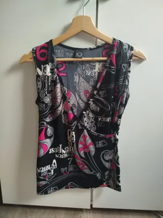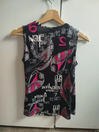 Blusa sin mangas con un llamativo estampado. - Diseño cruzado en la parte delantera. - Patrón con números y elementos gráficos. - Detalles en color rosa y gris.
