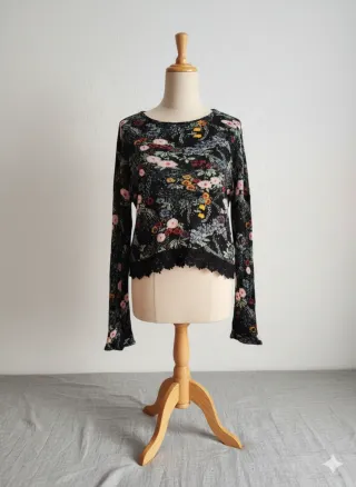 Bonita blusa con estampado floral y detalles de encaje. - Manga larga. - Cuello redondo. - Bajo con detalle de encaje.