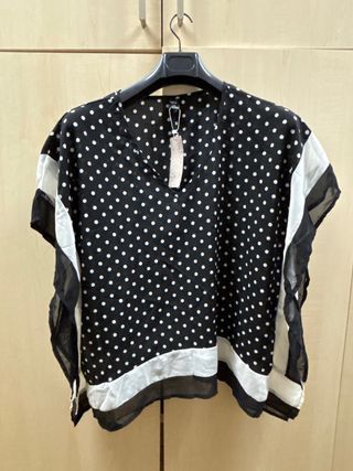 Blusa elegante con estampado de lunares blancos sobre fondo negro. Su diseño la hace versátil y cómoda. - Diseño de lunares blancos. - Acabado con detalles blancos y negros en los bordes. - Mangas cortas y escote en V.