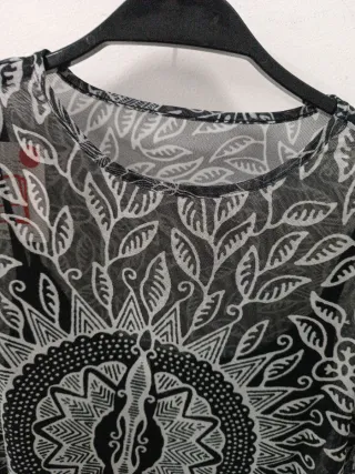 Blusa de manga larga con un llamativo estampado. - Diseño con motivos florales y un mandala central. - Tejido semitransparente. - Cuello redondo.