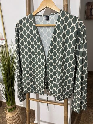 Blusa con un bonito estampado geométrico en tonos verdes y beige. Presenta mangas acampanadas y un cierre de lazada en la parte delantera. - Diseño con estampado geométrico. - Mangas acampanadas. - Cierre de lazada frontal.