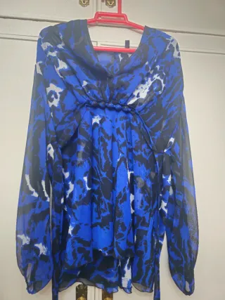 Elegante blusa azul de manga larga. - talla grande la blusa, si usas una 34 o 36 te puede valer bien - Diseño con cuello en V cruzado. - Puños abotonados. - Tejido ligero y fluido. PRECIO NEGOCIABLE