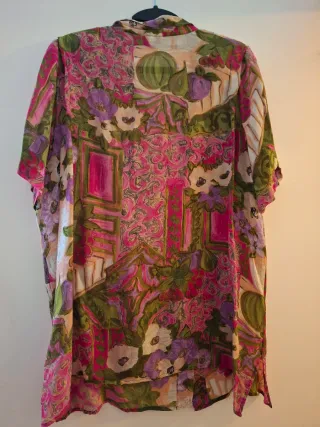 Blusa de mujer esrampada rosa y verde. Se trasparenta un poco. 100% viscosa. - Diseño con cuello camisero. - Manga corta. - Cierre de botones al frente. - Bolsillo en el pecho. Tiene unas hombreras pero no tienen relleno (ver foto).