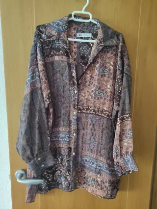 Blusa de manga larga con un llamativo estampado. Aunque pone talla S da hasta la XL sin problema , es ancha. - Diseño con cuello camisero. - Cierre de botones. - Puños abotonados.