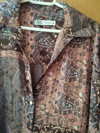 Elegante blusa de Zara con un diseño sofisticado. - Confeccionada en un tejido satinado. - Cierre de botones frontales. - Cuello camisero con detalle. - Mangas largas.