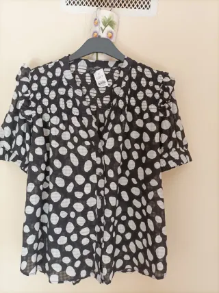 Blusa con un estampado de lunares en blanco y negro. Tiene un diseño con cuello en V y mangas cortas abullonadas. - Cuello con fruncido. - Cierre de botones. - Tejido ligero.