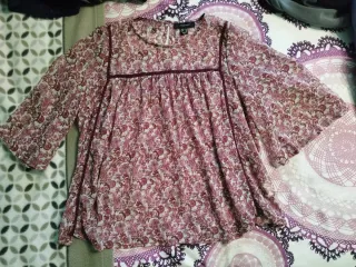 Bonita blusa de Primark con un estampado floral en tonos rosas y blancos. Tiene un diseño ligero y con vuelo. - Manga acampanada. - Detalle de pasamanería en el escote y la pechera. - Cuello redondo con abertura. - Tejido vaporoso.