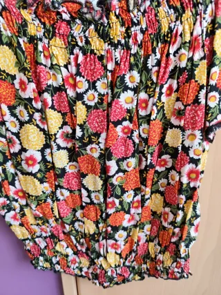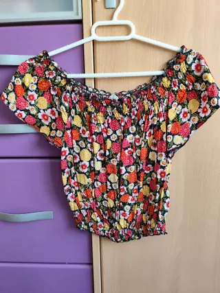 Blusa de C&A con un estampado floral vibrante y alegre. Es una prenda ligera y cómoda, perfecta para añadir un toque de color a tu armario. - Diseño de manga corta. - Escote elástico. - Bajo fruncido - Corte cropped - Talla 38