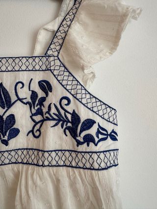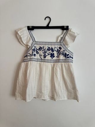 Bonita blusa blanca con detalles bordados. - Diseño con escote cuadrado. - Mangas cortas con volantes. - Bordado floral en color azul. - Tejido ligero con textura sutil.