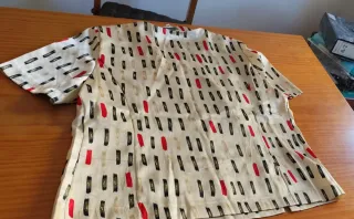 Blusa con un diseño vibrante y llamativo. - Estampado tipo patchwork con motivos geométricos y florales. - Cuello en V con detalle de botones. - Manga corta.