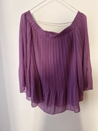 Elegante blusa de color morado con un diseño plisado. - Tejido ligero y vaporoso. - Mangas acampanadas. - Escote Bardot.