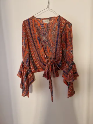 Blusa con un llamativo estampado paisley en tonos naranjas y azules. Presenta un diseño cruzado con lazada frontal y mangas acampanadas. - Diseño cruzado con lazada. - Mangas largas acampanadas. - Estampado paisley.