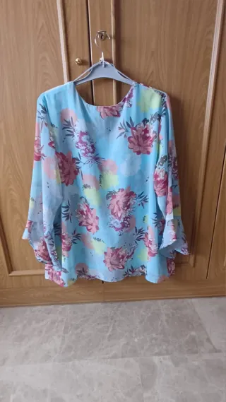 Elegante blusa de Lipsy con un estampado floral vibrante sobre un fondo azul claro. Presenta un escote en V y mangas acampanadas. - Diseño de flores en tonos rosas, amarillos y morados. - Tejido ligero y fluido. - Corte favorecedor.