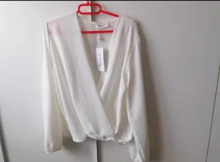 Blusa elegante de color blanco, con un diseño cruzado que le da un toque especial. Es una prenda nueva, ideal para añadir a tu armario. - Diseño cruzado. - Tejido con textura. - Manga larga.