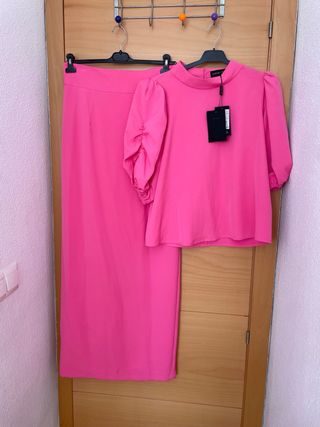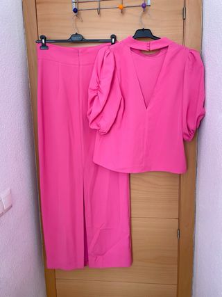Conjunto de pantalón y blusa de la marca Meryfor. - Pantalón de corte ancho. - Blusa con mangas cortas abullonadas y detalle de capa. - Color fucsia vibrante.