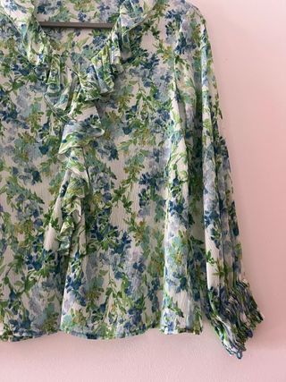 Blusa de seda con un bonito estampado floral. Es ligera y tiene un diseño muy alegre. Marca de Zara, retiré etiqueta por molestias. - Manga corta. - Cuello con detalle de volantes. - Cierre de botones. Hace talla 38 Medidas de axila a axila 48 cm. y largo 63 cm.